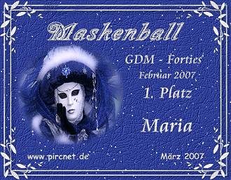 Ich habe mit 2 selbsterstellten Bildern an einem Grafikwettbewerb des Pircnet-Forums zum Thema "Maskenball" teilgenommen und erfreulicherweise und völlig unerwartet gewonnen. Hier meine Arbeiten und die Awards, die ich stolz entgegennehmen konnte.
